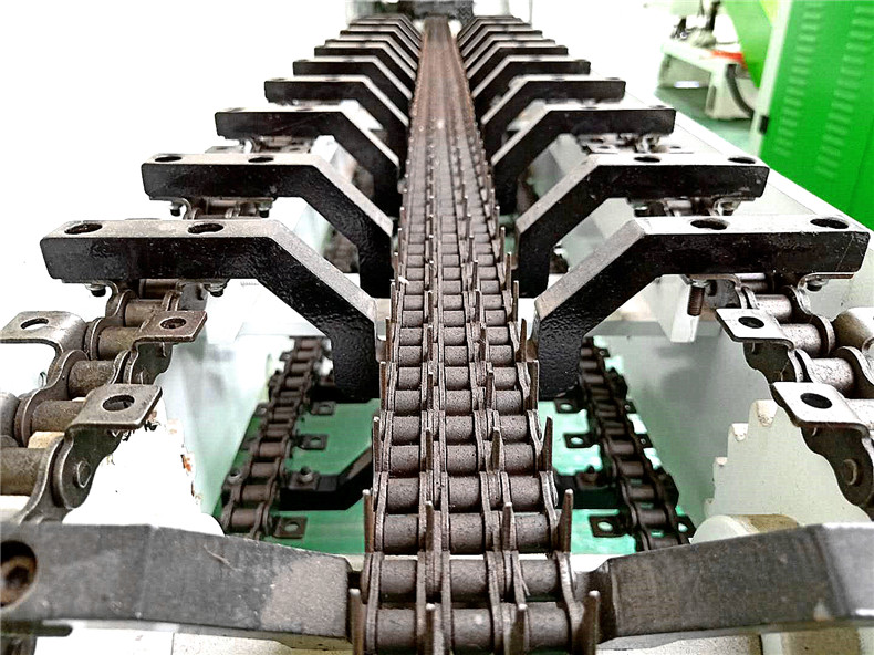 圓木開板機(jī) 創(chuàng)意木工機(jī)械廠圓木多片鋸進(jìn)料口采用V型鋼槽搭配四分三排的高低尖齒鏈條。